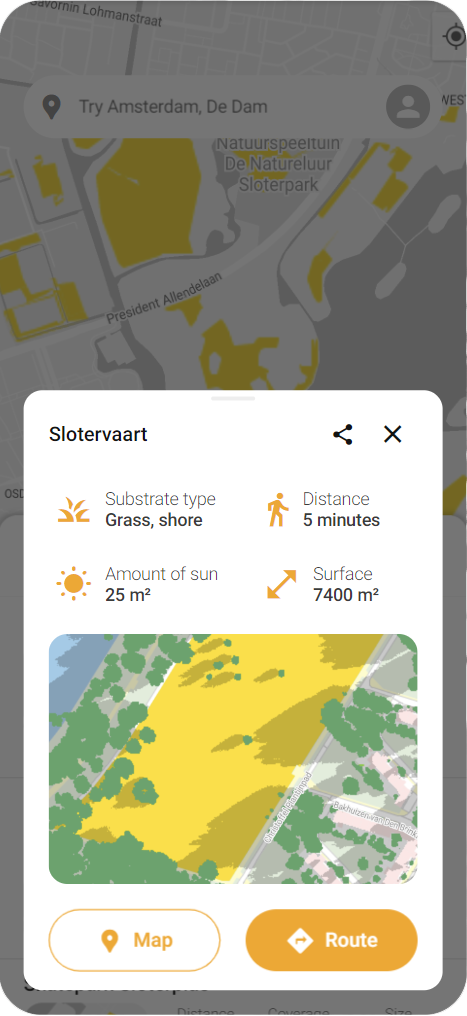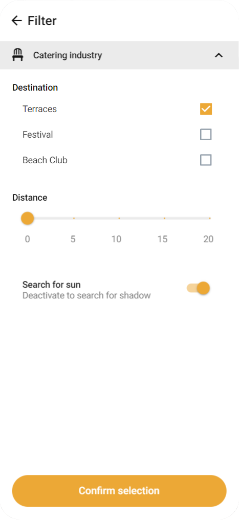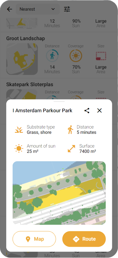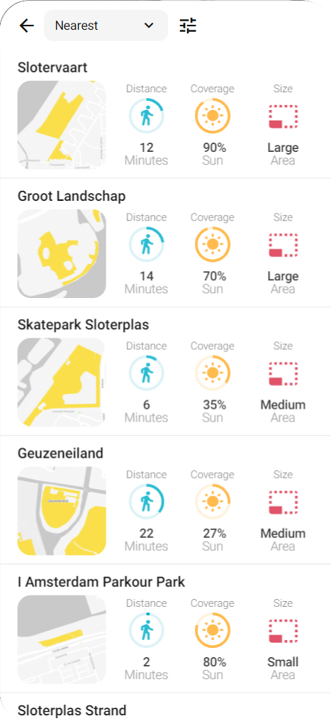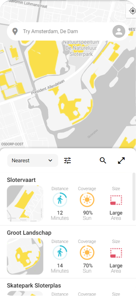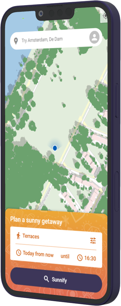 Zoeken maar! Sunnify toont alle plekken die matchen met jouw wensen. Bekijk interactief op de kaart welke plekken zon of schaduw hebben of sorteer ze eenvoudig op jouw voorkeur.