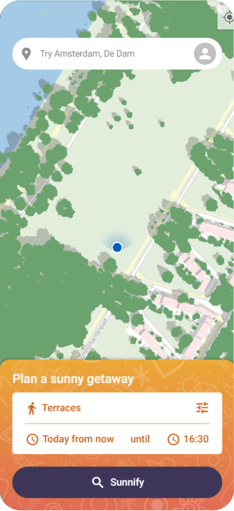Geef aan hoe lang je in de zon of schaduw wilt zitten. Of je nou het komende uur of de rest van de dag wilt genieten in de zon. Sunnify weet altijd wel een plek!